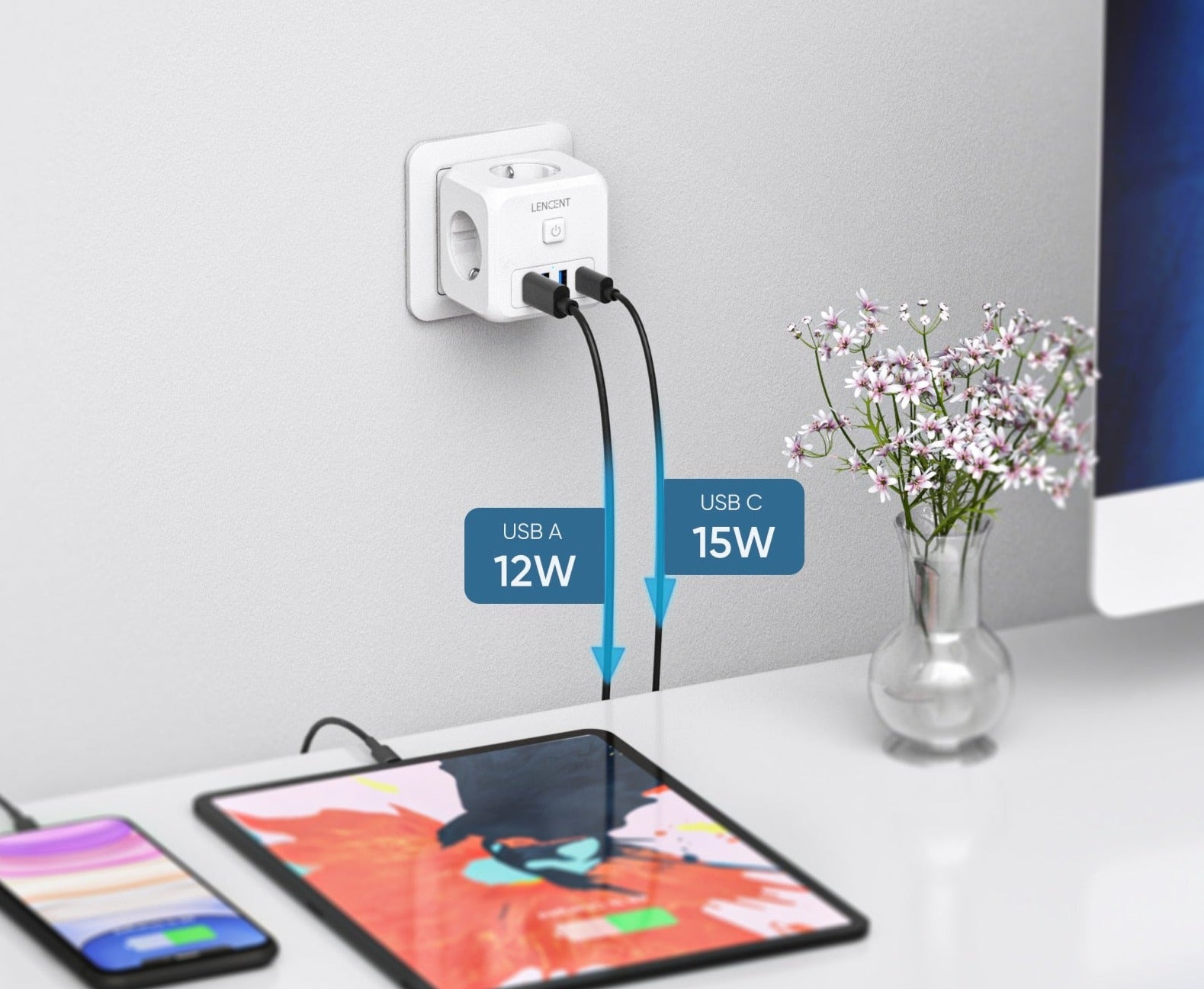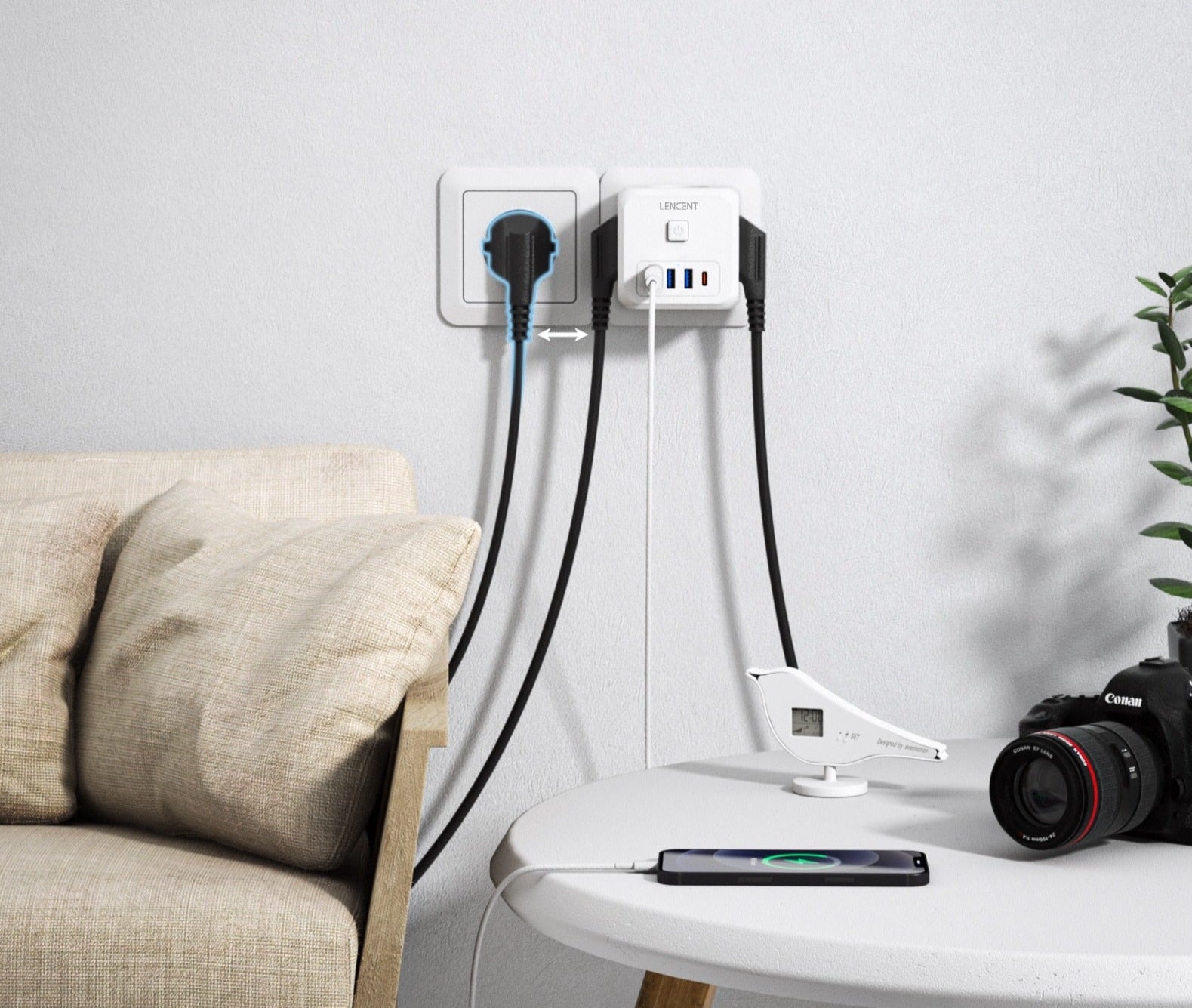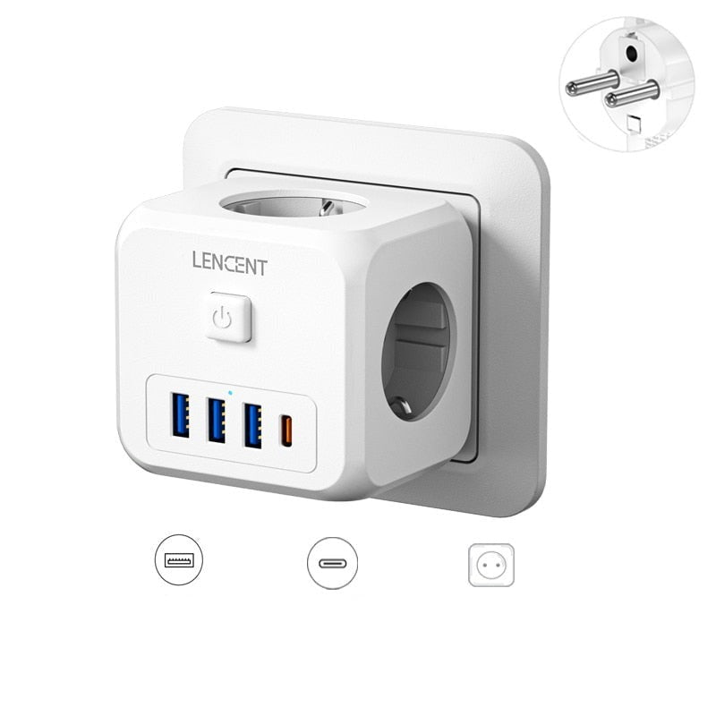 Inclui 3 tomadas ac + 3 portas usb + 1 portas tipo c. O plugue tem 3 tomadas, 3 portas usb e 1 porta tipo c são a combinação perfeita, que pode ser usado para vários dispositivos ao mesmo tempo. Ao mesmo tempo. Por exemplo, para computadores, telefones celulares, tablets, dispositivos com portas usb, etc. o plugue é muito silencioso e não tem ruído.